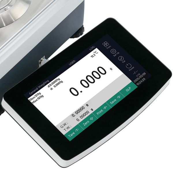 Précise, fiable et polyvalente, adaptée aux laboratoires de recherche, à l’industrie et à l’enseignement. Applications : pesée dynamique, comptage de pièces, calcul en pourcentage, détermination de la densité. Équipée d’un écran tactile haute résolution de 7’’ amovible, avec des menus et icônes intuitifs pour une interaction rapide. Gestion multi-utilisateurs avec jusqu’à 3 profils plus un administrateur, chaque utilisateur pouvant enregistrer jusqu’à 50 données. Indicateur de niveau à bulle et pieds réglables. Fonctions de connectivité continues incluant des options d’interface, un transfert de données rapide et une sortie d’impression conforme aux normes GLP/GMP. Connecteurs RS232 et USB bidirectionnels, cage de pesée antistatique. Dimensions externes (L × l × H) : 403 × 220 × 310 mm. Calibration interne automatique. Alimentation : 110–240 V / 50–60 Hz. Garantie : 2 ans
